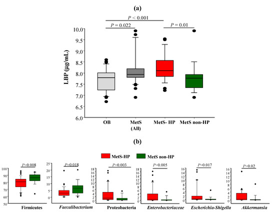 (a) Comparison of the plasma lipopolysaccharide-binding protein (LBP) concentration in OB, all MetS patients, MetS-HP, and MetS non-HP. The comparison was performed using ANOVA on Ranks and Dunn’s test. (b) Genera potentially involved in endotoxemia-related processes that were significantly different in MetS-HP vs. MetS non-HP patients.