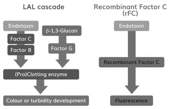 Drugs for parenteral administration require strict testing for contamination with regards to bacterial endotoxin. These can induce life-threatening inflammatory reactions after injection or infusion into the blood stream or interfere with the drug, leading to undesired side effects. In earlier days, samples were routinely injected into rabbits to examine the potential for endotoxin contamination. Over 30 years ago the Rabbit Pyrogen Test (RPT) was mostly replaced by Limulus Amoebocyte Lysate (LAL) assays for detection of endotoxin. LAL, using lysate of blood cells (i.e., amoebocytes) from Horseshoe Crabs, is sensitive for bacterial endotoxins [1,2,3]. Endotoxin specifically activates zymogen Factor C, the protein responsible for blood coagulation in Horseshoe Crabs [4]. Thus, instead of injecting samples into rabbits, blood is drawn and purified from Horseshoe Crabs for in vitro endotoxin-specific coagulation testing. Today, various test setups, from pure manual coagulation tests (i.e., gel-clot) to computerized kinetic chromogenic tests, are available. However, independent of the test setup the full coagulation cascade is represented in such assays including an alternative Factor G-mediated pathway (Figure 1). Via this pathway beta-glucans can activate LAL, leading to test interference [5,6]. Sample impurities and inadequate sample conditions like pH and temperature can further decrease specificity by influencing the reaction cascade [4]. In contrast, recombinant Factor C (rFC) assays are purely endotoxin-specific, as all additional Horseshoe Crab blood constituents are eliminated. Activated Factor C reacts directly with a fluorophore (Figure 1) [7]. Fluorescence detection delivers highly sensitive and accurate results. Even though rFC assays have been commercially available since 2003, LAL remains the compendial method when it comes to endotoxin testing for drug release. Although rFC assays are already used in various cases [8,9,10,11,12,13], rFC still lacks worldwide acceptance as a compendial test method for release testing. Its reaction mechanism with endotoxin is equivalent to the classical LAL test, thus rFC represents a promising chance to improve and modernize bacterial endotoxin testing (BET) for pharmaceutical quality control. The recombinant Factor C is biotechnologically engineered and thus a protein of high purity and low inter-lot variability. rFC enables assays with high endotoxin-specificity [11,12]. Hence, rFC-based tests have the potential to increase sensitivity and accuracy of classical bacterial endotoxin detection. The recombinant protein can easily and sustainably be produced in unlimited amounts without the use of animals, thus conserving vulnerable populations of Horseshoe Crabs. As the endotoxin testing is ubiquitously required for drug safety testing by pharmaceutical companies, the full acceptance of rFC as a compendial method would considerably contribute to the effort to eliminate animal-based tests in support of the European Directive 2010/63/EU for the protection of animals used for scientific purposes and consistent with the 3 Rs principle to reduce, refine or replace animals in testing.