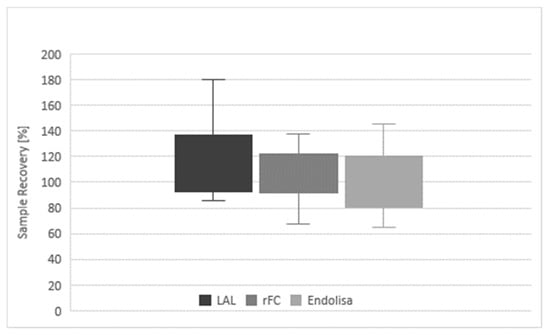 Figure 2: Diagram of results of LAL and recombinant assays. Overall sample recovery, differentiated by the individual test methods (LAL, rFC and EndoLISA) is given. The boxplots represent the lower (Q1) and upper (Q3) quartile and the minimum and maximum range.
