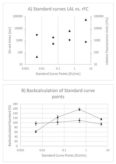 A higher accuracy and precision of rFC-based methods might be explained by the reaction cascade and standard curve interpretation. In case of LAL assays (see Figure 1), endotoxin activates Factor C, which in turn triggers the full reaction cascade (i.e., Factor B, Proclotting). Finally, the turnover of a chromogenic substrate is measured by optical density (OD). The resulting reaction kinetics of the individual standards (OD as function of time) are very fast. In order to obtain a broad dynamic test range, an OD threshold is defined for kinetic analysis, because an end-point analysis would result in a small dynamic test range. This threshold is used to measure the period of time until the threshold is reached. It is called onset time. To calculate endotoxin concentrations, standard curves are plotted using onset times as a function of the endotoxin concentration in a double logarithmic manner. This relation is intended to be linear. Due to the double logarithmic scale, deviations from linear behavior are difficult to perceive. It was described that hyperbole standard curve shapes are likely [16] and our results given in Figure 3B confirm this behavior. In consequence, the calculation of endotoxin might be over- or underestimated by using a linear model. This nonlinear curve behavior might be explained by the complex reaction cascade of LAL and one reason for the deviation from nominal values using a linear fitting model, as most commonly used. To this end, a nonlinear fit model that describes observed standard curve behavior might be recommended.