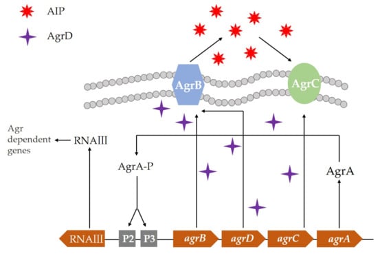 Signal molecules represented by small molecule oligopeptides, that is, autoinducing oligopeptide (AIP), are mainly used as quorum-sensing signal molecules in Gram-positive bacteria. AIP precursor molecules are generally formed by modification of the leader peptide, and it can be transported across the body with the help of the ATP-binding cassette (ABC) transporter for extracellular secretion. For example, note the Agr system in Staphylococcus aureus (Figure 2). With the increase of cell density, bacteria begin to synthesize a large number of virulence factors, thereby increasing their pathogenicity. This process is a response made by oligopeptide signal molecules to regulate gene expression and stimulate cells. When the signal molecule oligopeptide secreted to the outside reaches a certain concentration, it will bind to the receptor protein on the cell membrane and pass the phosphorylation/dephosphorylation cascade to pass the oligopeptide to the intracellular binding promoter to start the transcription mechanism and post-translational modifications that activate or inhibit the expression of the gene of interest [41].