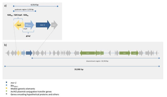 Schematic representation of mcr-1 gene flanking regions (a) mcr-pap2 element and upstream region including the antibiotic resistance gene blaTEM-1. (b) contig region enclosing mcr-1 gene.