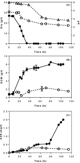 As observed in Figure 1A, glucose consumption was strongly influenced by the pH. In uncontrolled pH cultures, around 10 g/L of glucose were consumed by the yeast before cell growth was interrupted at 36 h due to acidic conditions (pH 4.2). This is in contrast with yeast growth in controlled pH cultures, where 30 g/L of glucose were fully consumed within 34 h of fermentation. Additionally, yeast metabolism by-products such as ethanol (2 g/L) and glycerol (1.2 g/L) were produced during fermentation. Hu et al. [31] reported that the optimal pH for X. dendrorhous growth is at 6. When the pH largely deviates from its optimal range, it prevents the cells from maintaining their optimal intracellular pH, which in turn results in failure of key intracellular enzymatic functions [32].