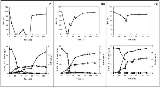 Effect of agitation speed on cell growth, glucose consumption, and astaxanthin and ethanol production in a 2-L bioreactor using semi-defined media with 30 g/L of glucose as carbon source. (A) 250 rpm; (B) 400 rpm; (C) 600 rpm. Fermentation conditions: aeration, 1 L/min; temperature, 20 °C; pH 6. Symbols represent: (▲) astaxanthin, AXN (mg/L); (●) glucose, Glu (g/L); (∆) dry cell weight, DCW (g/L); (○) ethanol, EtOH (g/L); (+) dissolved oxygen, DO (%).