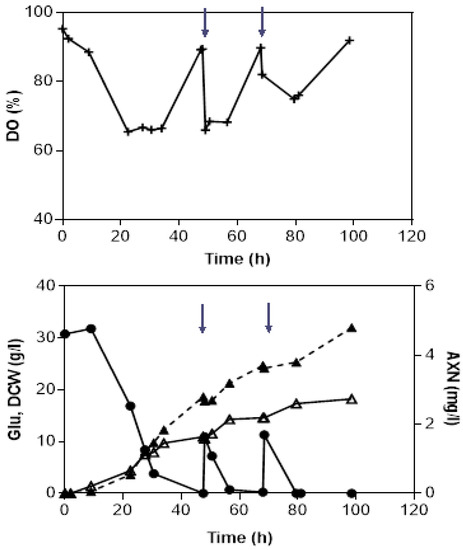Yamane et al. [10] investigated the effect of oxygen supply on growth and astaxanthin production of X. dendrorhous by controlling the DO levels in the fermenter. They found out that increasing the DO (from 20% to 80%) benefited both biomass and astaxanthin production and could inhibit the occurrence of the Pasteur and Crabtree effects, which are related to high glucose concentrations. The Pasteur effect refers to the inhibition of glycolysis by respiration whereas the Crabtree effect refers to the inhibition of respiration by glycolysis [10,36].