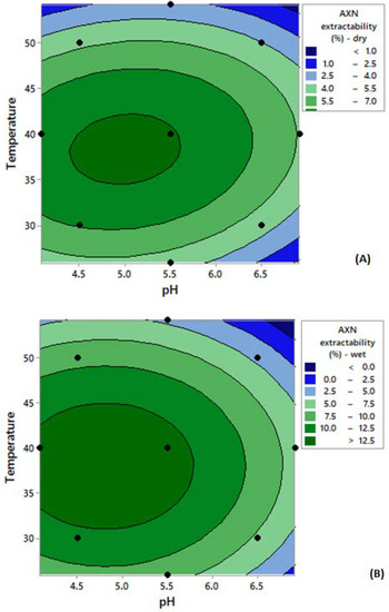 Contour plots depicting the effect of temperature and pH on astaxanthin extractability from X. dendrorhous cells following Accellerase 1500 treatment on (A) dry cells and (B) wet cells. * The black dots on the contour plot represent the experimental points. Abbreviation: AXN—astaxanthin.