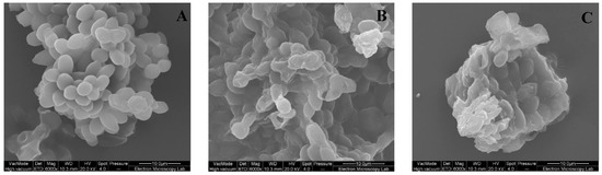 SEM images depicting X. dendrorhous (A) intact cells, (B) after Accelerace 1500 pre-treatment, and (C) after Glucanex pre-treatment.