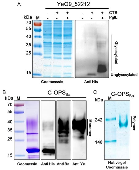 Figure 1. Analysis of glycosylated recombinant cholera toxin B subunit (rCTB) and CTB-OPSBa expressed in YeO9_52212. (A) YeO9_52212 was transformed with pET-CTB4573H or pET-pglL-CTB4573H and then induced with IPTG. A wild type strain was treated in the same way (negative control). Coomassie Blue staining (left) and western blotting (right) were performed. (B) The CTB-OPSBa (C-OPSBa) glycoprotein was purified from strain YeO9_52212 co-expressing PglL and rCTB. Samples were separated by 12% SDS-PAGE and analyzed by Coomassie Blue staining or western blotting using anti-His, anti-B. abortus (anti-Ba) or anti-Y. enterocolitica O:9 (anti-Ye) antibodies. (C) Coomassie Blue staining after native gel electrophoresis of C-OPSBa.