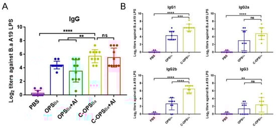 Figure 2. IgG responses against B. abortus A19 lipopolysaccharide (LPS). (A) IgG titers against A19 LPS were measured in sera from PBS-, OPSBa-, OPSBa+Al-, C-OPSBa-, and C-OPSBa+Al-vaccinated mice. (B) IgG subclass titers (IgG1, IgG2a, IgG2b, and IgG3) against A19 LPS were measured in sera from PBS-, OPSBa-, and C-OPSBa-vaccinated mice. Each value represents the mean ± standard deviation of log2-transformed titers in the sera of individual mice (shown as data points on the graphs) from each group (n = 10). The unpaired t-test was used to evaluate differences between IgG titers (**, p <0.01; ****, p <0.0001; ns, no statistically significant difference).