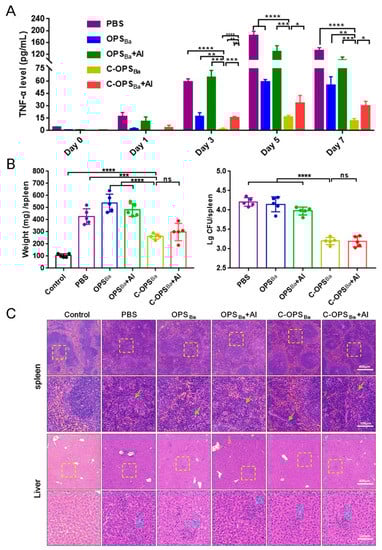 Seven days following infection, the mice were dissected and their spleens were removed. We found that the spleen size had increased following infection, with a significant increase in the spleen weight in the PBS group compared with the C-OPSBa group, and in the OPSBa group compared with the control group (Figure S4 and Figure 3B). We enumerated the bacteria in each spleen and observed approximately 103–103.5 CFU of A19 in C-OPSBa and C-OPSBa+Al-vaccinated mice. In contrast, the bacterial loads of other groups remained around 104–104.5 CFU in the spleen, which was significantly higher than those of mice immunized with C-OPSBa and C-OPSBa+Al (Figure 3B). These results indicated that mice immunized with C-OPSBa and C-OPSBa+Al were effectively protected against invading pathogens and the resulting lethal cytokine storms.