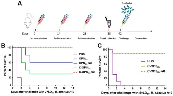 Figure 4. Survival of BALB/c mice after challenge with a lethal dose of B. abortus A19. Mice were challenged 2 weeks after final immunization by intraperitoneal injection with different doses of A19 and survival was monitored. (A) Schematic diagram of the challenge experiment. (B) Mice were immunized with PBS, OPSBa, OPSBa+Al, C-OPSBa or C-OPSBa+Al and challenged with ~1.54 × 108 CFU/mouse (3 × LD50) of A19 (n = 10). (C) Mice were immunized with C-OPSBa, C-OPSBa+Al or PBS then challenged with approximately 2.51 × 108 CFU/mouse (5 × LD50) of A19 (n = 10).