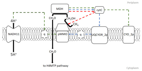 - Redox-arm mode: In this mode, ubiquinol is the electron donor for methane oxidation while methanol dehydrogenase (MDH) gives electrons via cytochrome c directly to complex IV. This leads up to proton motive force and ATP production. Recently, this mode of electron transfer has been suggested to be the main mode in Methylocystis, another type II methanotroph genus [17,18].