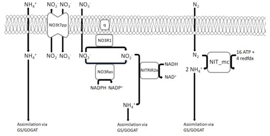 Nitrate assimilation can be done by its conversion into nitrite via ubiquinol or NADP-dependent nitrate reductase (model reaction IDs: NO3Ras or NO3R1), followed by the subsequent reduction via NAD-dependent nitrite reductase (model reaction ID: NTRIR2x).