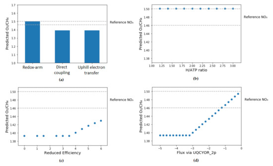 Parameter fitting. The grey dotted lines refer to literature values for oxygen:methane molar consumption ratio ranges on high-copper nitrate medium. (a) Comparison of predicted O2/CH4 molar ratios between 3 modes of electron transfer to pMMO, with no additional parameter fitting. (b) For redox-arm mode, the number of protons necessary for the synthesis of 1 mol ATP was iterated. There was no change in the predicted O2/CH4 molar ratio with all values fitting into experimental range. (c) For direct-coupling mode, a part of the flux was constrained to go via PMMOipp. Despite a slight improvement in the predicted O2/CH4 molar ratio, this value is still below experimentally determined range. (d) For uphill electron transfer mode, the reverse flux via ubiquinol-cytochrome c reductase was fixed at different values. The predicted O2/CH4 molar ratios felt into experimental values when reverse reaction flux was in 0.20–1.20 mmol gDCW−1 h−1 range.