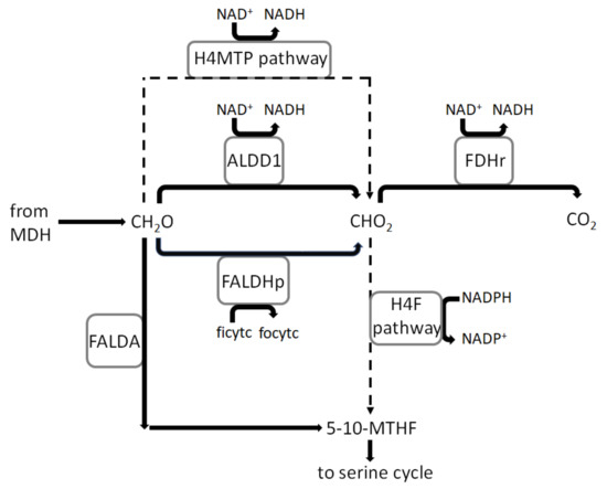 Formaldehyde and formate oxidation and assimilation pathways as implemented in iMsOB3b. The continuous lines represent a single reaction, while the dashed lines represent a series of reaction. ALDD1 refers to non-specific aldehyde dehydrogenase, FALDHp refers to formaldehyde dehydrogenase, 5-10-MTHF refers to 5-10-methylenetetrahydrofolate.