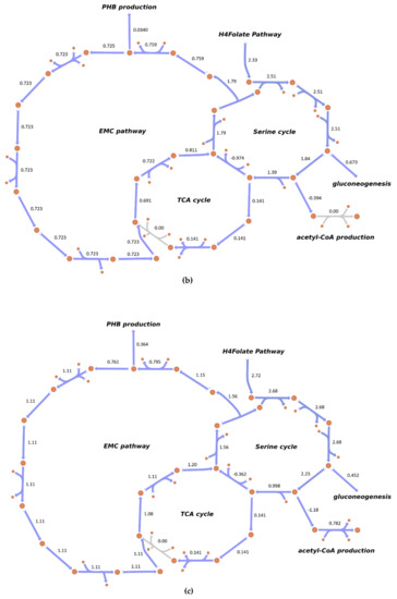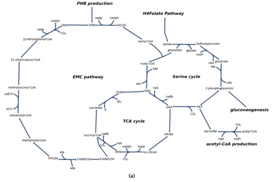 Both serine cycle and the EMC pathway share reactions with tricarboxylic acid cycle (TCA) cycle, thus, forming a series of tightly connected metabolic cycles (Figure 5a). The serine cycle shares malate dehydrogenase with the TCA cycle, and malyl-CoA synthetase and malyl-CoA lyase share reactions with the EMC pathway. The EMC pathway, on the other hand, shares succinate dehydrogenase and fumarase reactions with TCA cycle. In addition to the reactions describe above, the EMC pathway also shares reactions with polyhydroxybutyrate synthesis (acetyl-CoA C-acetyltransferase, acetoacetyl-CoA reductase), a compound with a significant commercial interest.