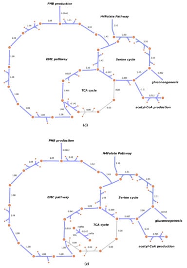 13C labelling studies have shown that at least 1/3 of acetyl-CoA comes from pyruvate, most likely via pyruvate dehydrogenase (model reaction ID: PDH). The unconstrained network selected malyl-CoA produced via malyl-CoA lyase as the main source of acetyl-CoA, indicating that the serine cycle can replenish the acetyl-CoA pool completely (Figure 5b). After the model was constrained to produce 1/3 of acetyl-CoA via pyruvate dehydrogenase, the flux towards the acetyl-CoA and EMC cycles increased (Figure 5c). This is expected as the EMC cycle strongly depends on the acetyl-CoA pool, which was increased via forced constraint. In case of the serine cycle, the flux towards phosphoenolpyruvate (PEP) slightly increased, while the flux from PEP significantly decreased. This happened because PEP acts a precursor for pyruvate. The imposed constraint drained flux from the serine cycle for acetyl-CoA production, thus, leaving phosphoenolpyruvate carboxylase and subsequent serine cycle reactions with decreased flux. The flux toward a lower part of TCA (citrate synthase, aconitate hydratase and isocitrate dehydrogenase) was not changed, indicating no effect of the constraint on it. The change in the source of acetyl-CoA did not have any effect on the predicted in silico growth rate too. One interesting aspect of the given flux distribution is that the model seems to possess an incomplete TCA cycle with no flux that goes via 2-oxoglutarate dehydrogenase. This suggests that the pool of succinyl-CoA and downstream metabolites (succinate, fumarate) is replenished primarily via the EMC pathway. This seems to be at odds with previous enzymatic studies which suggested there was a complete TCA cycle in type II methanotrophs [67]. Another interesting aspect is the fact that the source of malate comes primarily via the EMC pathway too, as the flux via malate dehydrogenase is much lower than those of fumarase (0.362 mmol gDCW−1 h−1 vs. 1.2 mmol gDCW−1 h−1). This seems to agree with 13C labelling data that has shown that fumarate is the most likely precursor of malate [37].