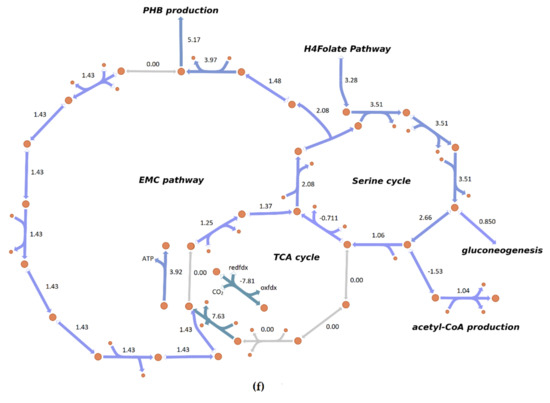 The flux distribution maps between the serine cycle, EMC pathway and TCA cycle. The maps were drawn with the help of Escher software [52]. The circles refer to metabolites, the arrows refer to reactions, and numbers refer to flux values in mmol gDCW−1 h−1. (a) Reference map for metabolite names, carbon and energy balance. CRN refers to crotonyl-CoA, 3HB refers to 3-hydroxybutyrate, AACOA refers to acetoacetyl-CoA, PEP refers to phosphoenolpyruvate, OAA refers to oxaloacetate, AKG refers to alpha-ketoglutarate, FUM refers to fumarate, MAL refers to malate; S- and R-MMCOA refer to S- and R-methylmalonyl-CoA respectively; and PPCOA refers to propionyl-CoA. (b) Unconstrained flux distribution map. No acetyl-CoA production flux via pyruvate is recorded. (c) Flux distribution when 1/3 of acetyl-CoA is forced to be produced from pyruvate. Figure 5D,E,F refers to reversible TCA flux distribution maps: (d) 2-oxoglutarate is allowed to be produced from succinyl-CoA via reversible 2-oxoglutarate dehydrogenase reaction; (e) 2-oxoglutarate is allowed to be produced from succinyl-CoA via forward 2-oxoacid ferredoxin synthase reaction only; (f) both irreversible 2-oxoglutarate reaction and 2-oxoacid ferredoxin synthase reactions are allowed to carry flux.