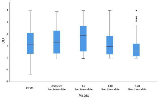 Box plot diagram showing the optical densities (OD) for serum and undiluted or diluted liver transudate (1:2, 1:10, or 1:20).