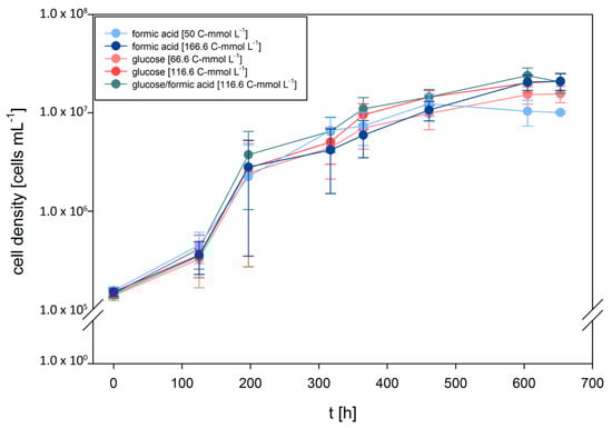 Recently, we investigated growth characteristics of D. amylolyticus on cellulose, fructose, arabinose, glucose, lactose, maltose, starch, and sucrose. Moreover, we partially re-annotated the genome and metabolically reconstructed the central carbon metabolism []. According to the metabolic reconstruction of D. amylolyticus, it seemed to be possible that the organism could grow through metabolisation of formate. To elucidate the growth kinetics of D. amylolyticus on formate and to be able to compare them to glucose and formate–glucose mixtures, end-point experiments were designed to analyse growth kinetics in defined medium with each of the substrates at the same concentration (166.6 C-mmol L−1). Additionally, formate and glucose were tested at concentrations of 50 and 66.6 C-mmol L−1, respectively, to be able to examine the growth kinetics at lower substrate concentrations. The results of the growth characteristics are shown in Figure 1. Cleary, D. amylolyticus did not grow on a medium where formic acid was omitted (Supplementary Figure S1). The lag time lasted approximately 125 h, until growth of D. amylolyticus on each of the substrates commenced. The key physiological variables are presented in Table 1. The organism grew almost equally well on all substrates tested and at all concentrations. Astonishingly, the organism grew on formate as the sole energy source with a µmax of 0.032 h−1. A slightly higher µmax of 0.035 and 0.036 h−1 was only obtained on glucose and formate/glucose, respectively. The differences in µmax might be explained by slightly different concentrations and hyperbolic relationship between µ and the substrate concentration [,]. In a previous study, we showed that D. amylolyticus comprises a µmax of 0.059 h−1 at a concentration of 166.5 C-mmol L−1 glucose []. In our previous studies [,], growth of D. amylolyticus resulted in low cell densities only, a characteristic shared with many other hyperthermophilic microorganisms []. The growth of D. amylolyticus on glucose was accompanied by lactate, acetate, and formate production, whereas growth on formate resulted in production of acetate, citrate, and ethanol (Table 2).