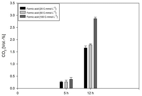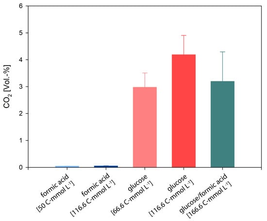 Following this, we examined the gaseous product formation spectrum from all quadruplicate closed batch experiments on formate, glucose, and formate/glucose. CO2 was the only gas detectable in all growth experiments. The CO2 concentrations are shown in Figure 2, and an overview of CO2 productivities are presented in Table 2. In cultures which were grown on formate, the cumulative CO2 levels were in the ppm range. However, during growth on glucose or formate/glucose, the cumulative CO2 values were more than one order of magnitude higher. H2 could not be detected in any growth experiment, which is in contradiction to experiments in bioreactors [], but in agreement to our previous closed batch experiments []. This indicates that D. amylolyticus did not to use the electrons from formate or glucose to balance homeostasis by producing H2. However, instead it could be possible that the electrons were used to balance anaplerotic reactions, which indicates that during formate metabolization, CO2 was assimilated into biomass through some of the several annotated CO2-fixing enzymes []. However, up to now it is not clear if the ATP for the CO2 fixation is retrieved from substrate level phosphorylation via glycolysis or from chemiosmotic ATP production or the pseudo-TCA cycle.