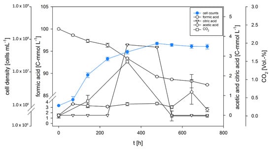 Growth, substrate uptake, and production kinetics of D. amylolyticus on 100 C-mmol L−1 formate. The results indicate that CO2 and citric acid were produced and consumed completely during the cultivation and only after the consumption of CO2 and citric acid, acetic acid was produced.