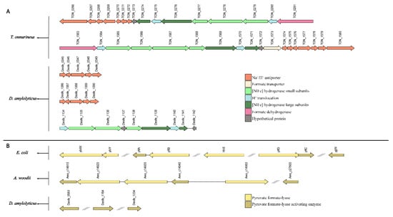 Comparison of genetic organization of (A) the fdh complex subunits in T. onnurineus, and (B) the pyruvate formate lyase (PFL) complex subunits in E. coli and A. woodii to the genetic organisation in D. amylolyticus.