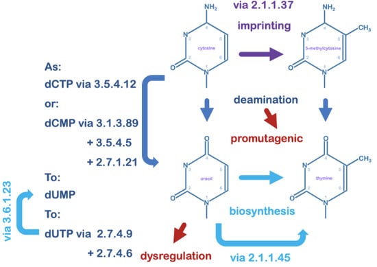 DNA pyrimidines and their interconversion. The pyrimidine uracil as a deoxynucleotide is a precursor in thymidine biosynthesis. Deoxyuridine can accrue in DNA by misincorporation under conditions of nucleotide pool perturbation and imbalance such as during viral replication; its unique structure can create dysfunction in gene regulation. The DNA base cytosine is also converted to 5-methylcytosine in epigenetic imprinting. Both cytosine and 5-methylcytosine can convert in situ to uracil and to thymine, respectively, via spontaneous loss of the 4-amino group under ambient cellular conditions. This conversion in the context of the original base pair is considered promutagenic and must be repaired to retain sequence fidelity upon replication. Enzymes listed by KEGG Orthology are: 2.1.1.37 (cytosine-5)-methyltransferase; 2.1.1.45 thymidylate synthase; 2.7.1.21 thymidine kinase; 2.7.4.6 nucleoside diphosphate kinase; 2.7.4.9 thymidylate kinase; 3.1.3.89 HD-domain 5′-nucleotidase; 3.5.4.5 cytidine deaminase; 3.5.4.12 dCMP deaminase.
