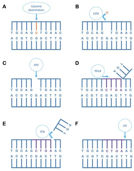 The base excision repair pathway. (A) Uracil spontaneously occurs in DNA due to the deamination of cytosine bases. If left uncorrected, the uracil-containing strand will give rise to a permanently mutated daughter strand upon replication. (B) A uracil-DNA glycosylase (UDG) cleaves the uracil base from the DNA backbone, leaving an abasic site in the DNA. (C) An AP-endonuclease (APE) cleaves the phosphodiester backbone, 5′ of an abasic site [AP refers to apyrimidinic, or lacking a pyrimidine; it can also refer to apurinic in other contexts]. (D) A type-B DNA polymerase (POLB), typically involved in short-patch DNA repair, resynthesises several bases complementary to the undamaged strand while displacing the cleaved strand beginning at the nick generated by AP-endonuclease. (E) A Flap-Endonuclease (FEN) cleaves off the displaced DNA strand after the B-type DNA polymerase has dissociated, leaving behind a nick in the DNA duplex. (F) A DNA ligase (LIG) seals the nick to return DNA to its canonical pre-damaged state.