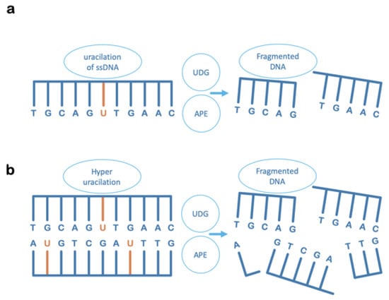 The occurrence of multiple, proximal uracil residues spaced at oligonucleotide lengths from each other on opposing strands, would cause the initial steps of the BER pathway to create double-strand breaks with the loss of intervening oligo-length sequences (Figure 3) [26]. Although high concentrations of uracil bases in DNA would not occur naturally under ambient conditions, fascinatingly, this is something that can be enzymatically induced by cellular factors. The situations where enzymatic conversion of DNA cytosine to uracil is known to occur, are: (1) Following sensing of virus DNA in the cytoplasm [27,28]; and (2) under programmed conditions in the humoral immune response [29,30]. In addition, relevant as regards unusually high concentrations of DNA uracil: Viruses such as HIV-1 appear to involve a uracil-DNA stage prior to retroviral integration [31,32,33]; and, certain bacteriophages comprise thymine-free uracil-DNA genomes [34,35,36,37]. In all cases, cellular Ung in concert with AP-endonuclease would act as a potent restriction enzyme upon invading uracil-rich pathogen DNA [38].