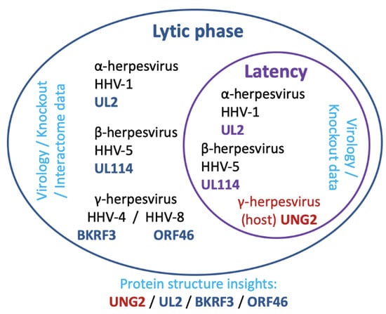 In gammaherpesviruses, the virus-encoded Ung (known as BKRF3 in HHV-4, and ORF46 in HHV-8) is likely to be an essential component of the lytic replisome in HHV-4 [49,50], and similarities in structural data supporting a possible mode for its interactions indicate this is probably the case also in HHV-8 (Figure 5) [51,52], and interestingly the human UNG2 isoform is known to be recruited to the maintenance of latency by the protein LANA in HHV-8 (Figure 6) [69].