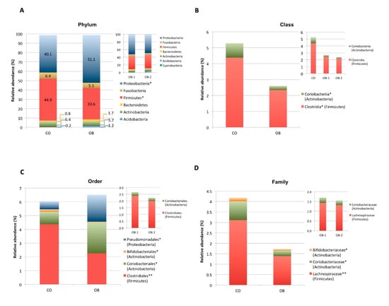 In particular, bacterial species significantly (p < 0.01) reduced in OB respect to CO were Oribacterium asaccharolyticum (Firmicutes), Atopobium parvulum (Actinobacteria) and Fusobacterium nucleatum (Fusobacteria) (Figure 3F).