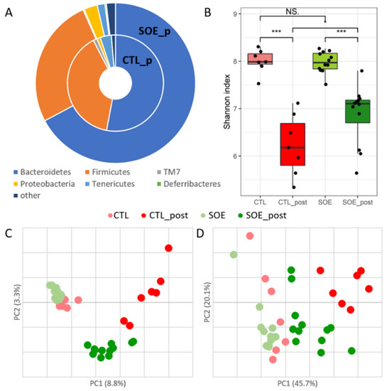 The Shannon diversity index measures the within-sample diversity in each group separately [58]. As expected, we found similar richness between the groups preceding the SOE supplementation; however, decreased richness was observed following it (p < 0.05) (Figure 1B). The SOE supplemented mice showed higher microbial diversity than control mice following the treatment period.