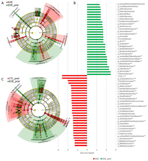 Differently abundant taxa of control and SOE treated mice. Bacterial composition was assessed by Illumina MiSeq 16S rRNA gene sequencing of fecal DNA. (A) Cladogram representation and (B) linear discriminant analysis (LDA) scores of differentially-abundant taxa between SOE supplemented mice preceding (red; 8 weeks of age) and following (green; 12 weeks of age) the study period. (C) Cladogram representation of differentially-abundant taxa between control (red) and SOE (green) supplemented mice following the study period (12 weeks of age). Differences were identified using LefSe and displayed in color. Each circle′s diameter is proportional to the taxa relative abundance. Only taxa meeting LDA ≥ 2.5 and p < 0.05 are shown. * p < 0.01, ** p < 0.005.