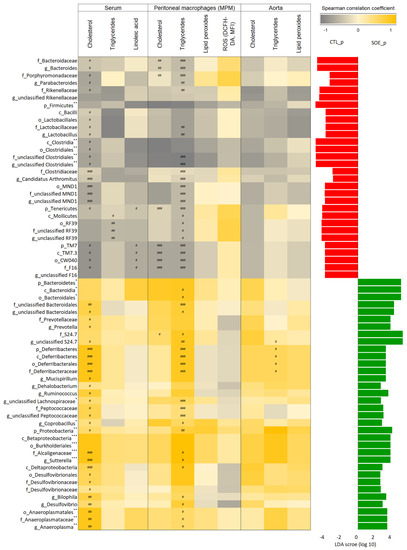 Next, we evaluated the association between SOE-induced alterations in the gut microbiota’s composition and atherosclerosis-related biomarkers for each mouse. To do so, the 64 bacterial taxa which shifted following SOE treatment (LDA > 2.5) were selected and their relative abundances were correlated with the examined atherosclerosis-related biomarkers: serum cholesterol, triglycerides and linoleic acid; MPM cholesterol, triglycerides, lipid peroxides and ROS; and aorta cholesterol, triglycerides and lipid peroxides (Table S1).