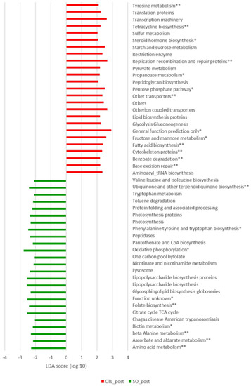 LDA scores of differently abundant inferred gut microbial metabolic pathways of control and SOE treated mice following the experimental period. Predicted microbial functions were inferred by PICRUSt from 16S rRNA gene sequences, which were assigned by closed reference Operational Taxonomic Units (OTUs) picking method. Control (red) and SOE (green) mice were compared by LEfSe analysis of KEGG based on level 3 pathways. Only pathways meeting LDA ≥ 2.5 and p < 0.05 are shown. * p < 0.01, ** p < 0.005.