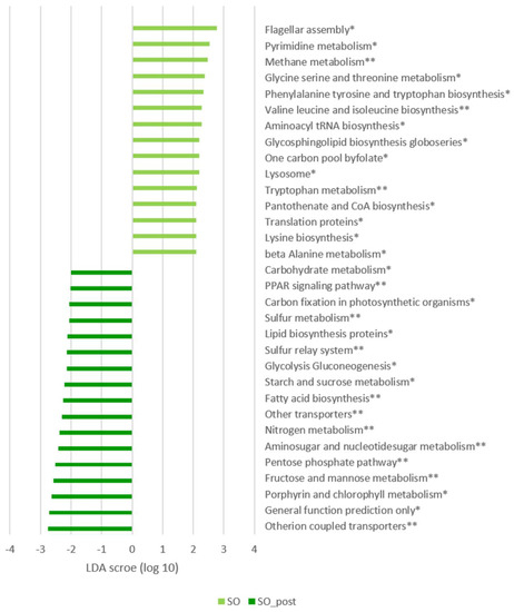 LDA scores of differently abundant inferred gut microbial metabolic pathways preceding and following SOE supplementation. Predicted microbial functions were inferred by PICRUSt from 16S rRNA gene sequences, which were assigned by closed reference OTU picking method. SOE mice preceding (light green) and following (dark green) the supplementation, were compared by LEfSe analysis of KEGG based on level 3 pathways. Only pathways meeting LDA ≥ 2.5 and p < 0.05 are shown. * p < 0.01, ** p < 0.005.