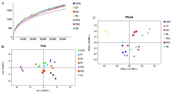 The rarefaction curves of the 16S rRNA gene reads derived from the Sobs index at the operational taxonomic unit (OTU) level after normalization (A), principal component analysis (PCA) plot (B), and principal coordinate analysis (PCoA) plot (C), showing variation in bacterial community structure among the seven alfalfa silage treatments with no additive (CON), Lactobacillus plantarum (LP), gallic acid (GA), phenyllactic acid (PA), pectin (PEC), pectinase (PEE), and cellulase (CE). Each point represents an individual sample.