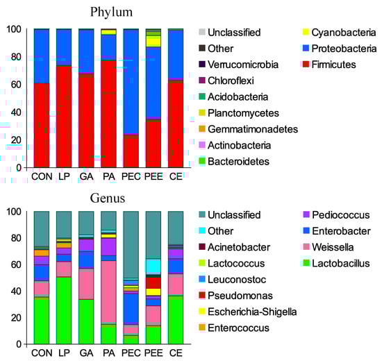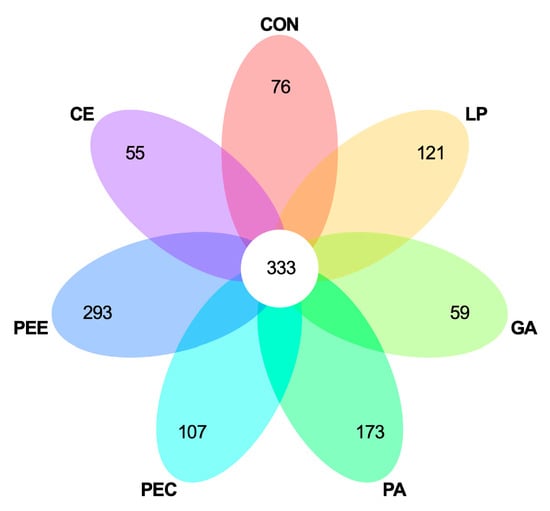 In total, 2,025,710 raw reads were obtained for the bacterial 16S rRNA genes in the seven groups. After screening, 1,866,479 effective tags were obtained, accounting for 92.15% of the raw reads. The rarefaction curves showed clear asymptotes, and the number of reads was the same for all samples after normalization (Figure 1A). The Good’s coverage value for all samples was greater than 99.1%. The results of the PCA and PCoA with bray distances indicated that the treatment groups of PA, PEC, and PEE were largely separated from other groups including CON, LP, GA, and CE at the OTU level (Figure 1B,C). There were 1217 OTUs that were identified in the silage of the seven groups, among which 333 OTUs were found in all the seven groups and accounted for 27.4% of the total OTUs (Figure 2). There were 76, 121, 59, 173, 107, 293, and 55 OTUs that were identified individually in CON, LP, GA, PA, PEC, PEE, and CE, respectively (Figure 2). For the alpha diversity analysis, a similar level of species richness existed among the seven groups based on the Sobs, Simpson, Ace, and Chao index analyses, which indicated that there was a similar tendency of diversity and uniformity among the seven groups (Table 2). The Shannon index analysis indicated that there were diversity and uniformity between CON and GA, between CON and PEC, and between PEC and PEE.