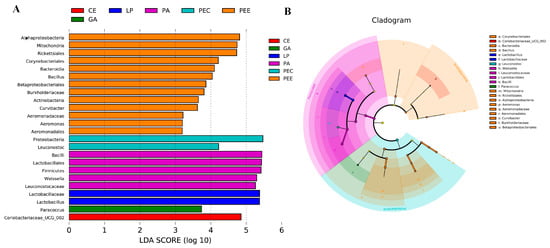 The non-strict version of LEfSe was used to determine the bacteria most likely to explain the differences among the different additives’ treatments (Figure 4). Lactobacillus was higher in the LP group, Paracoccus was higher in the GA group, Weissella was higher in the PA group, Leuconostoc was higher in the PEC group, Bacillus, Aeromonas, and Curvibacter were higher in the PEE group, and Coriobacteriaceae_UCG_002 was higher in the CE group compared to the other groups.