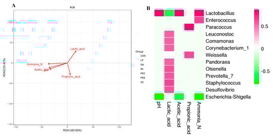 RDA revealed that the bacterial community structure was affected by fermentation characteristics (including pH, lactic acid, acetic acid, propionic acid, and ammonia nitrogen), in which the length and angle of each arrow represents its degree and direction of correlation to the bacterial community in the RDA (no permutations), respectively (Figure 5A). As shown in Figure 5A, pH (p = 0.001), lactic acid (p = 0.004), acetic acid (p = 0.001), propionic acid (p = 0.016), and ammonia nitrogen (p = 0.001) significantly affected the bacterial community structure. The samples that belong to the PEE and PEC groups, located in the positive direction of the lactic acid arrow, were positively related to lactic acid, whereas most of the other samples were negatively related to lactic acid.