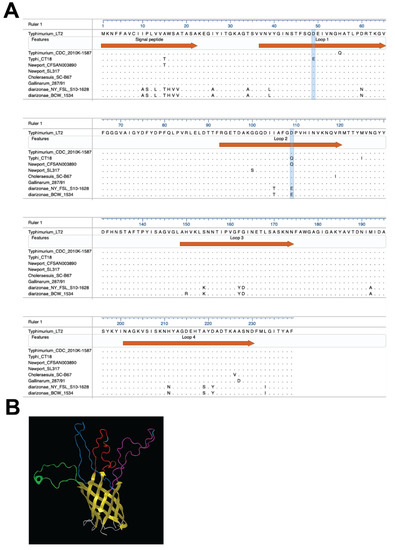 PagN sequences and predicted structure. (A) Alignment of PagN alleles from different Salmonella strains (Table S3) [10] each representing N strains from one or more serovars, or clusters within serovars or subspecies with the same sequence in the surface loops of mature PagN; S. Typhimurium_LT2 (n = 68) with same sequence for S. Enteritidis (n = 74), S. Pullorum (n = 29), S. Dublin (n = 74), and a cluster of Newport strains (n = 25); S. Typhimurium_CDC_2010k-1587 (n = 7); S. Typhi_CT18 (n = 75); S. Newport_CFSAN003890 (n = 23); S. Newport_SL317 (n = 22); S. Choleraesuis_SC-B67(n = 74); S. Gallinarum 287/91(n = 23); S. diarizonae NY_FSL_S10-1628 (n = 3) and S. diarizonae_BCW_1534 (n = 45). (B) S. Typhimurium mature PagN model predicted with I-TASSER. Color codes are for the membrane spanning beta-barrel (yellow), the periplasmic loops (grey), surface-exposed loop 1 (purple) with residue 49 (turquoise), loop 2 (red) with residue 109 (turquoise), loop 3 (green) and loop 4 (dark blue).