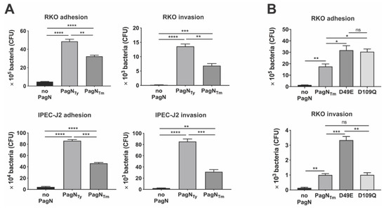PagN sequence alignments for 52–75 strains for each of the seven S. enterica serovars, including S. Typhimurium [10], highlighted that all PagN had aspartic acid residues at position 49 and 109, with the exceptions of S. Typhi that had a glutamic acid at position 49, and a group of S. Newport strains that had a glutamine at position 109 (Figure 1A). Since the allelic PagN proteins of all strains of S. Typhi and S. Typhimurium varied at these two positions and were each predicted to be located in a different bacterial surface loop (Figure 1B), we investigated their relative involvement in bacterial adhesion and invasion. For this, we generated PagNTm with a D49E or a D109Q substitution and expressed them in E. coli strain AAEC189. Although both mutated PagN mediated better bacterial binding to RKO cells than did PagNTm, only the D49E substitution in PagN had a significantly stronger effect on bacterial invasion (Figure 3B). This result highlighted the contribution of the S. Typhi glutamic acid at position 49 for the improved interaction of PagN with a host cell receptor to promote bacterial uptake. This result is consistent with a role for the PagN allele in the increased pathogenicity of S. Typhi relative to S. Typhimurium pathogenesis following human infection, in agreement with the former serovar’s hematogenous bacterial spreading in humans resulting frequently in sepsis, in contrast to the latter serovar and its pathogenesis that is usually contained in the gastro-intestinal organs.