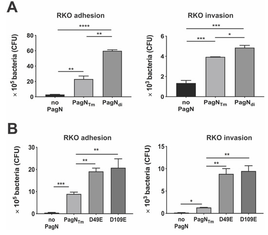 Binding and uptake of E. coli expressing PagN from non-enterica allelic variants. (A) Adhesion and invasion of E. coli AAEC189 expressing pagN allele from S. diarizonae PagN (PagNdi) and S. Typhimurium PagN (PagNTm) to RKO cells showed the bacteria expressing PagNdi binds significantly better than PagNTm (p < 0.01) and was slightly more invasive (p < 0.05). (B) A substitution of aspartate to glutamate at site 109 in S. Typhimurium PagN (D109E) increased both binding and invasion of E. coli into RKO cells as compared to the bacteria expressing PagNTm (p < 0.01). Data represent one of three separate and reproducible experiments, each with triplicate data expressed as mean ± SEM (* p < 0.05, ** p < 0.01, *** p < 0.001 and **** p < 0.0001).