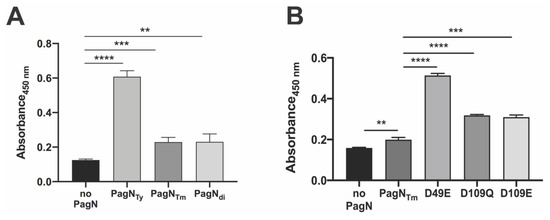 To determine the potential role of PagN residue 49 and 109 in PagNTy binding to laminin, we tested the three mutants described above. As for the intestinal epithelial cell binding results, bacteria with a glutamic acid at position 49 of PagNTm (D49E) bound significantly better to laminin than did bacteria with PagNTm (Figure 5B). Glutamic acid or glutamine at position 109 of PagNTm (D109E and D109Q) also increased binding, albeit less efficiently.
