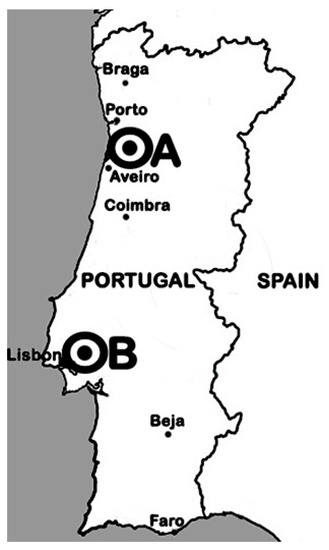 Bacteria were isolated from effective root nodules of wild L. parviflorus plants growing in two field sites in Portugal: Beduído, which belongs to Estarreja city (site A; 40°46′0.064″ N 8° 35′12.035″ W); and fields of the “Companhia das Lezírias” farming exploration company, located in Samora Correia, which belongs to Benavente city (site B; 38° 49′24.7″ N 8°50′36.8″ W; Figure 1). Nodules were surface sterilized [9] then individually crushed before a droplet was spread on a plate with yeast-mannitol agar (YMA) supplemented with congo red dye according to [48,49]. Plates were incubated at 28 °C in the dark for 1 week. The isolate’s purity was checked by examining colony morphology and congo red absorption. Sub-culturing was conducted when more than one type of colony was present. Each pure isolate was stored at 4 °C and at −80 °C with 20% of glycerol.