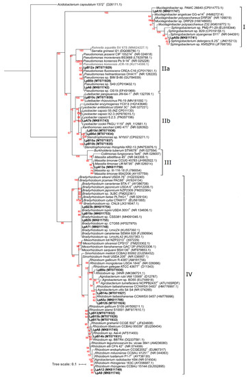 - Mousavi, S.A.; Willems, A.; Nesme, X.; de Lajudie, P.; Lindström, K. Revised phylogeny of Rhizobiaceae: Proposal of the delineation of Pararhizobium gen. nov., and 13 new species combinations. Syst. Appl. Microbiol. 2015, 38, 84–90. [Google Scholar] [CrossRef]