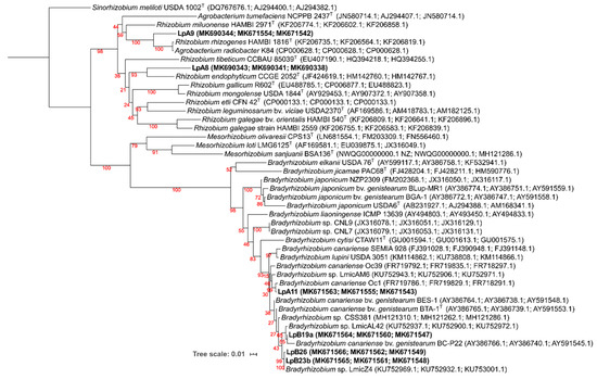 Phylogeny of concatenated sequences of glnII (300 nt), atpD (328 nt), and recA (333 nt) genes, based on a total of 968 nt. Bootstrap values are shown in red at each node. Analyses were conducted with IQ-tree using Maximum Likelihood (ML) and ModelFinder (Best model: TIM+F+I+G4) methods. NCBI Genebank accession codes are shown. Sinorhizobium meliloti USDA 1002T (DQ767676.1; AJ294400.1; AJ294382.1) was selected as an outgroup. Isolates obtained from L. parviflorus nodules are in bold.