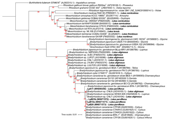 Genistoid legumes (e.g., Lupinus spp., Cytisus spp, Adenocarpus spp., Genista spp., Spartium ssp, etc.), Serradella (Ornithopus spp.), and L. uliginosus have been shown to be nodulated by closely related bradyrhizobia that are in the same cross-inoculation group [9,16,17]. The genus Bradyrhizobium comprises highly diversified bacteria, with 39 described species thus far [18,19,20], including some photosynthetic strains [21,22,23]. The 16S rRNA gene is very conserved within this genus and, like the symbiotic genes, has been shown to be laterally transmitted [24,25]. Thus, for a better phylogenetic prediction, multilocus sequence analysis (MLSA) of protein encoding housekeeping genes, such as recA, atpD and glnII, is more suitable [16,24,25,26].