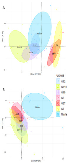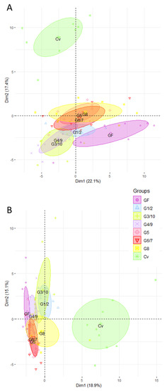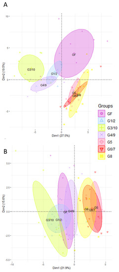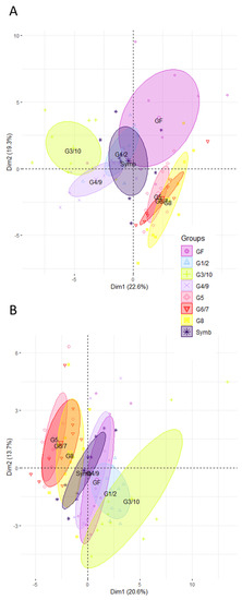 The ileal and colonic gene expression differs according to which genotype of Symbioflor2® is administered. Ileal (A) and colonic (B) gene expression was analyzed in mice mono-associated with one of the six Symbioflor2® genotypes (G1/2, G3/10, G4/9, G5, G6/7, G8) and in germ-free (GF) mice. Rq values that represent the abundance of transcripts relative to GF group were used for principal component analysis (PCA) after trimming datasets for the least informative genes (see Section 2). In total, 56 genes were retained for PCA in the ileum and 40 in the colon; n = 10 for each group of mice.